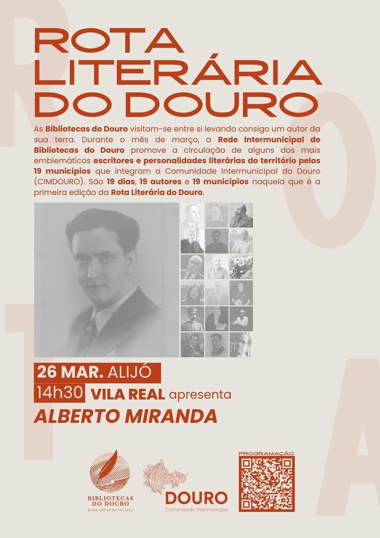 A Biblioteca Municipal de Vila Real vai apresentar o poeta Alberto Miranda na Biblioteca Municipal de Alijó no próximo dia 26 de março, no âmbito da primeira edição da Rota Literária do Douro. Durante 19 dias, os municípios do Douro trocam autores e histórias numa rota que liga bibliotecas, leitores e território.